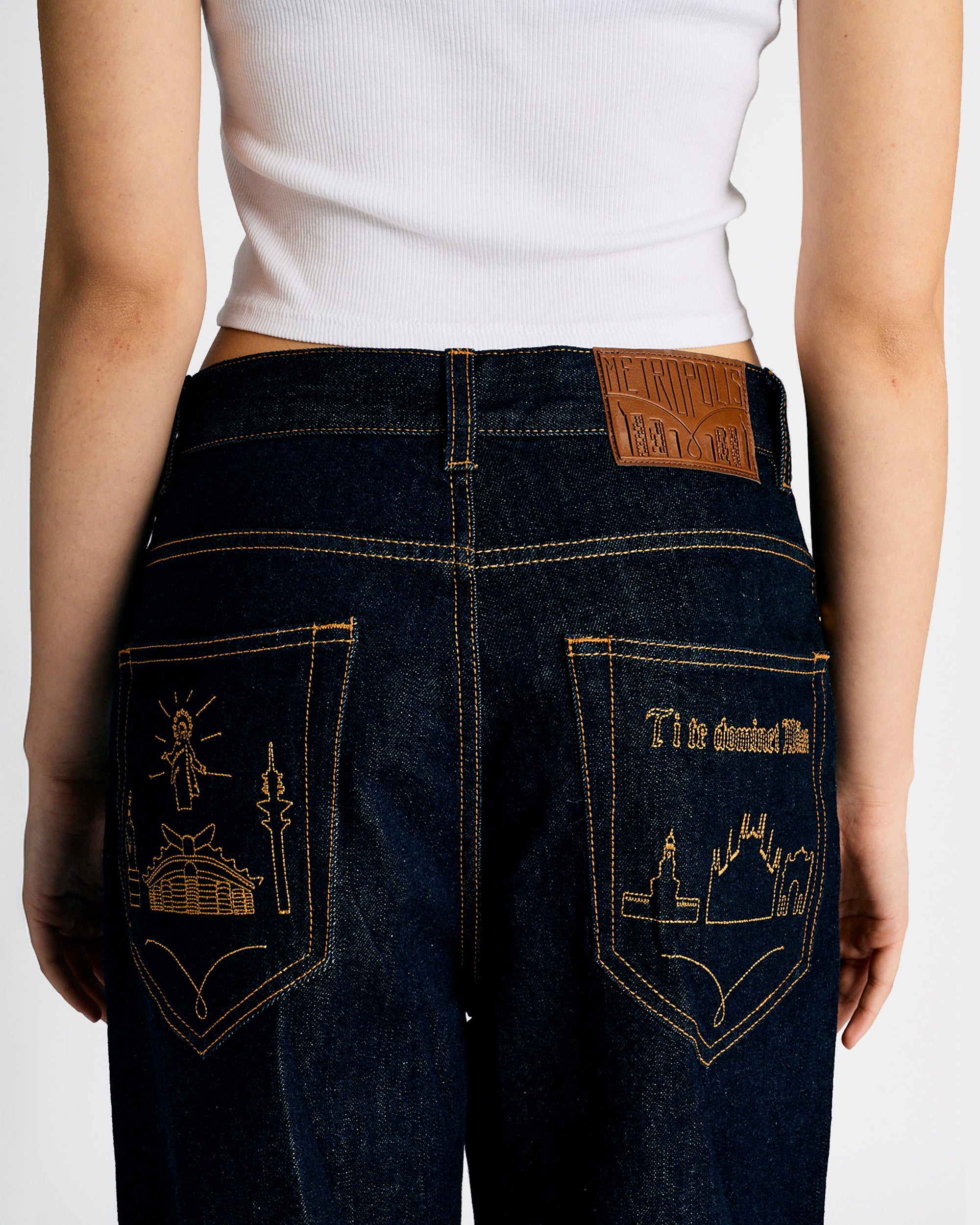 Sulle tasche posteriori, il ricamo di San Siro cattura l’anima collettiva di Milano: non solo uno stadio, ma un luogo di emozioni, di memoria, di comunità. E tra i ricami dell’Arco della Pace e del Castello Sforzesco si riconosce la Milano più intima, quella delle mattine di sole, dei passi lenti e dei respiri sospesi prima che tutto ricominci a correre.